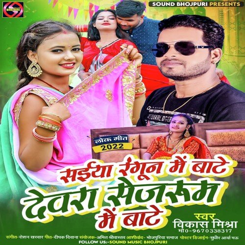 Saiya Rangun Me Bate Devra Sej Room Me Bate (Lokgeet) is sung by Vikas Mishra. Music composed by Gaurav Vishal Singh. Lyrics written by Deepak Deewana. Released on 2022-10-01. Label: Sound Bhojpuri | ST.